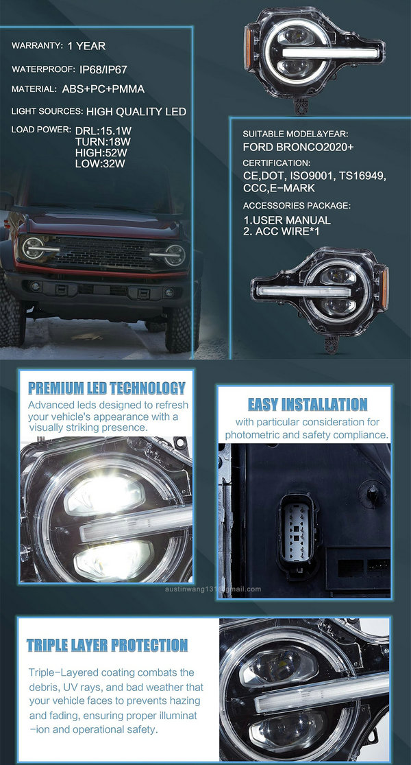 Running lights(Startup animation), low beam, high beam, turn signals. Perfect fit for 2020-2025 Ford Bronco
